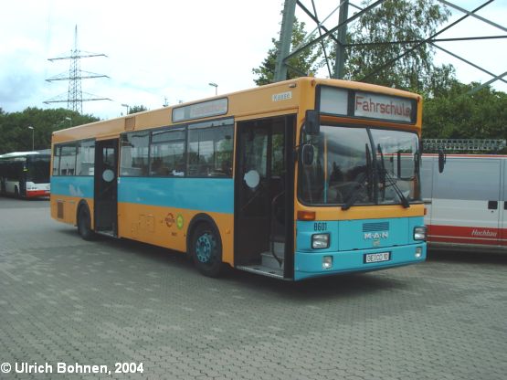 Dieser zum Aufnahmezeitpunkt bereits 18 Jahre alte Bus in der klassischen Bogestra-Lackierung türkis-coloradogelb (der Letzte in dieser Farbgebung) wird immer noch als Fahrschulfahrzeug eingesetzt. Während des Tages der offenen Tür bestand die Möglichkeit, nach erfolgreich bestandenem Gewinnspiel einmal selbst den KOM zu fahren (und das auf normalen Straßen!). Während einer Pause auf dem Betriebshof konnte der MAN SL 202 mit leichten Lackschäden (siehe Bereich über der Hinterachse) digital festgehalten werden.