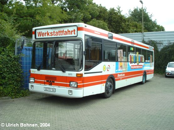 Aus dem Jahr 1988 stammt dieser MAN SL 202 der Bogestra mit der Wagen-Nr. 8815. Nach dem Ende seines Linieneinsatzes verbleibt das Fahrzeug weiterhin im Bogestra-Fuhrpark und wird seit einiger Zeit - nach erfolgter Umrüstung des Innenraums (u. a. Entfernen von Sitzreihen und Einbau von Schränken) - als Werkstattwagen im Bogestra-Liniennetz eingesetzt. Bemerkenswert ist, dass der Bus noch immer mit der Werbung für einen Babyausstatter versehen ist.