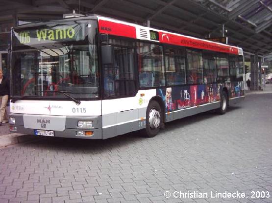 Wagen 0115, ein MAN A 21 (NL 223) aus der Beschaffungsserie des Jahres 2001, konnte am wiederum am 27.10.2003 am Mönchengladbacher Hauptbahnhof im Bild festgehalten werden. Dieser Bus trägt eine Werbung für die Theaterkooperation Krefeld-Mönchengladbach.