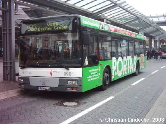 Ab 1999 wurden in Mönchengladbach Niederflurbusse der 3. Generation beschafft. Von 1999-2002 wurden ausschließlich MAN-Niederflurbusse in Dienst gestellt. Wagen 9901, der nach der Nummer allererste MAN NL 223 bei der NVV, konnte am 27.10.2003 am Mönchengladbacher Hauptbahnhof aufgenommen werden.