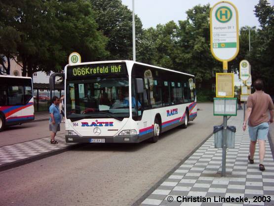 Seit Ende 2002 ist dieser EvoBus-Mercedes O 530 Citaro von Rath-Reisen aus Viersen-Süchteln im Auftrag der SWK Mobil GmbH aus Krefeld unterwegs. Das Foto des Fahrzeuges im Einsatz auf der Linie 066 gelang wiederum am 10.06.2003 am Bahnhof der Stadt Kempen. Diese Aufnahme wurde von Christian Lindecke zur Verfügung gestellt!