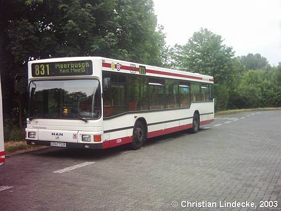 Wagen 7225 der Rheinbahn, ein 1993 in Dienst gestellter MAN A 10 (NL 202), ist ein Vertreter der alten Lackierungsvariante der Rheinbahn. Kurz bevor die Aufnahme am 10.06.2003 gelang, kam der Bus aus Moers als Linie 831 am Meerbuscher Haus Meer an. Diese Aufnahme wurde von Christian Lindecke zur Verfügung gestellt!
