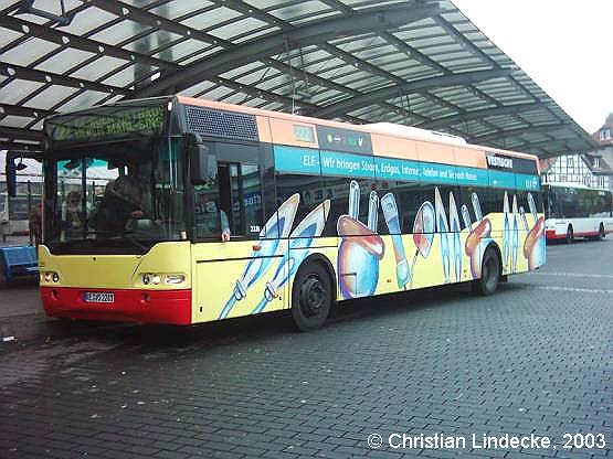 Eine auffällige (Beinahe-)Ganzreklame trägt der Wagen 2281 der Vestischen Straßenbahnen, dessen Foto am 30.10.2003 am Hauptbahnhof von Recklinghausen entstand.