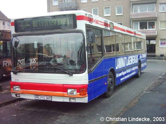 1992 stellten die Vestischen Straßenbahnen MAN NL 202 der ersten Generation in Dienst. Durch die einen Tag zuvor aufgebrachte seitliche Reklame kommt die CityExpress-Lackierung leider nicht so recht zur Geltung. Christian Lindecke nahm den Bus am 30.10.2003 am alten Recklinghäuser Busbahnhof auf.