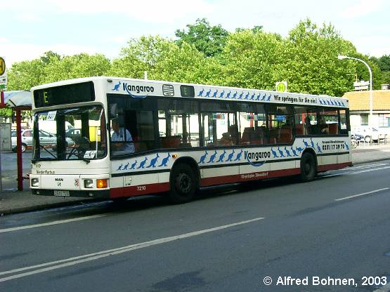 Hier der auf der Titelseite erwähnte Bus der Düsseldorfer Rheinbahn. Wagen 7210, ein 1992er MAN NL 202, konnte mit einer Einsatzwagen-Beschilderung und dem Papierschild "927" am 01.07.2003 in Duisburg-Rheinhausen abgelichtet werden. Es ist - so glaube ich - das erste Mal, dass ein West-Bus-Fahrer ein Rheinbahn-Fahrzeug lenkt. Diese Aufnahme wurde von Alfred Bohnen zur Verfügung gestellt!