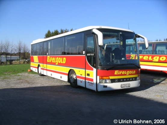 Die typische Eifelgold-Lackierung trägt dieser Setra S 315 UL-GT, der ebenfalls auf dem Eifelgold-Betriebshof in Simmerath festgehalten werden konnte.
