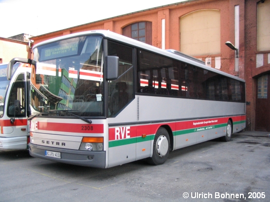 So, nun kommen wir zum Kapitel Schienenersatzverkehr (SEV): Wie schon zum Titelfoto geschrieben, fanden am 03.04 und 10.04.2005 aufgrund von Bauarbeiten Euregiobahn-SEVs zwischen Heerlen/Niederlande und Aachen (bzw. Weisweiler) statt. Am 03.04.2005 kam u. a. dieser 2004er Setra S 315 UL - Wagen 4010 - zum Einsatz, der hier vor Beginn des Dienstes auf der RVE-Einsatzstelle Aachen in der Nähe des Hauptbahnhofes mit bereits "präpariertem" Zielschild aufgenommen werden konnte.
