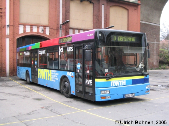 Was die Werbung für die Rheinisch-Westfälische Technische Hochschule (RWTH) in Aachen angeht, ist dieser MAN NÜ 263, RVE 5053, einzigartig bei BVR/RVE und RVN. Der Bus wurde Ende 1998 in Dienst gestellt und konnte am 10.04.2005 auf der RVE-Einsatzstelle Aachen abgelichtet werden.