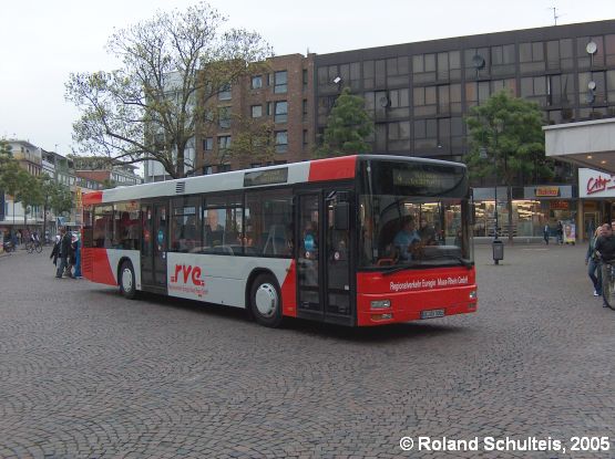 Im Mai 2005 hat dieser Bus seine RWTH-Vollwerbung verloren und wurde mit einer neuartigen RVE-Lackierung in rot-weiß versehen. Das Bild unten zeigt den Wagen am 13.05.2005 im Einsatz auf der Linie 4 auf dem Willy-Brandt-Platz in Aachen. Vielen Dank an Roland Schulteis für dieses Foto!