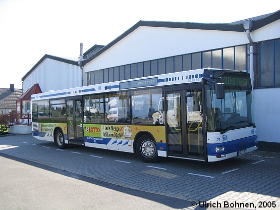 Die Dürener Kreisbahn (DKB) stellt einige Fahrzeuge in der Nähe ihres Einsatzgebietes ab, so auch diesen MAN A 21 (NL 263), der am 02.04.2005 in Schmidt/Nordeifel aufgenommen werden konnte. Der DKB-KOM 21 trägt die aktualisierte Variante der Lotto-Werbung, mit welcher immer mehr Busse (natürlich auch bei anderen Verkehrsbetrieben) versehen werden.