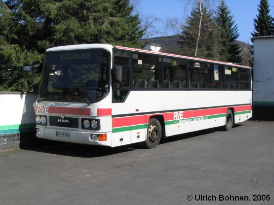 Die Firma Lehner aus Gemünd, ein RVE-Subunternehmer, hat stets einige Leihwagen des Auftraggebers im Bestand. Am 02.04.2005 konnte Wagen 5015, ein MAN ÜL 312 des Baujahres 1995, bei blauem Himmel auf dem Lehner-Betriebshof abgelichtet werden.