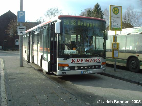 Dieser EvoBus-Setra S 315 NF gehört Kremers aus Wassenberg und wurde am 05.02.2003 in Brüggen abgelichtet (leider etwas durch den Laternenmast verdeckt). Das Fahrzeug hat gerade als Linie SB 88 aus Viersen kommend seine Endstation erreicht. Außer der SB 88 bedient Kremers auch noch die NVV-Linie 012, die von Brüggen nach Niederkrüchten führt.