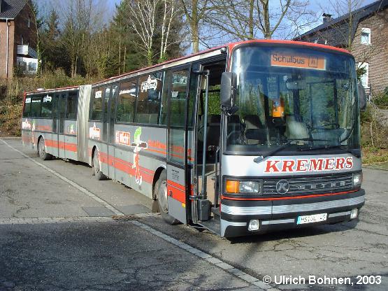 Kremers aus Wassenberg (Kreis Heinsberg) fährt u. a. im Auftrag der Mönchengladbacher NVV AG und bedient zwei Linien als Subunternehmer. Am 05.02.2003 konnte dieser Kässbohrer-Setra SG 221 UL auf dem Marktplatz des niederrheinischen Städtchens Brüggen (Kreis Viersen) abgelichtet werden, als sich der Fahrer eine Pause zusammen mit einem Kremers-Kollegen gönnte (nächstes Bild).