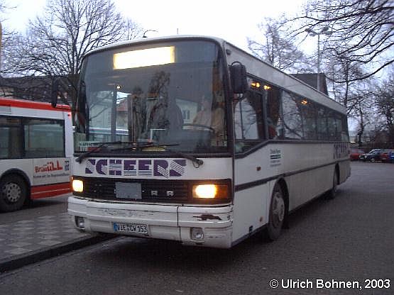 Zunächst eine kleine Anmerkung: Bei der Beschreibung dieses Fotos halte ich mich aus Höflichkeitsgründen etwas zurück! Christel Wynen aus Viersen setzt diesen Kässbohrer-Setra S 215 SL u. a. im Auftrag der Busverkehr Rheinland GmbH ein. Das Fahrzeug konnte am 07.02.2003 am Kempener Bahnhof im Einsatz auf der Linie SB 87 in Richtung Nettetal-Lobberich fotografiert werden. Das Fahrtziel ("87 Net.-Lob.") wird auf einem braunen Stück Pappkarton angezeigt (zu erkennen neben dem Auftragsschild hinter dem rechten Scheibenwischer); Fahrscheinentwerter sind in dem Bus nicht vorhanden, die Bremslichter nach eigener Beobachtung defekt. Übrigens: Die Firma Scheers gibt es seit 1999 nicht mehr... So, das sollte genügen!