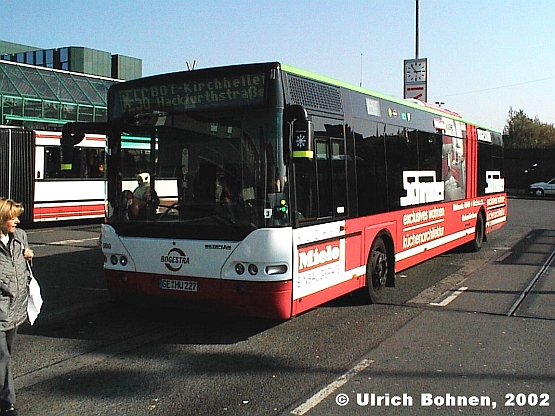 Eine Werbung für ein Möbelhaus, die auch teilweise über die Seitenfenster reicht und recht gut zur roten Original-Lackierung passt, trägt der Bogestra-Wagen 0010, ein Neoplan N 4416 des Baujahres 2000. Auch erwähnenswert sind die ungewöhnlichen Warnaufkleber auf beiden Außenspiegeln (Schneestern und neongelber Streifen).