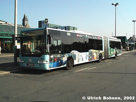 Die Bogestra (Bochum-Gelsenkirchener Straßenbahnen AG) beschaffen seit dem Jahre 2000 ihre Neufahrzeuge im Rahmen der KÖR (Kooperation Östliches Ruhrgebiet). Interessanterweise hat bisher dreimal Neoplan die gemeinsame Ausschreibung für sich entscheiden können. Wagen 0065, ein Neoplan N 4421 mit Bogestra-Eigenwerbung, konnte am 11.10.2002 am Gelsenkirchener Hauptbahnhof aufgenommen werden.