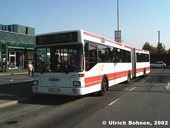 Zu den Bussen, die voraussichtlich im Jahre 2003 ausgemustert und sicherlich wieder durch Neoplan-Niederflurgelenkbusse ersetzt werden, gehört der Bogestra-Wagen 8867, ein MAN SG 242 aus dem Jahre 1988. Der Bus wurde in die StadtLinien-Lackierung der Bogestra umlackiert. Die Front ist jedoch nur in weiß lackiert - eventuell aufgrund eines Unfalls und der daraus resultierenden Neulackierung der Vorderseite.