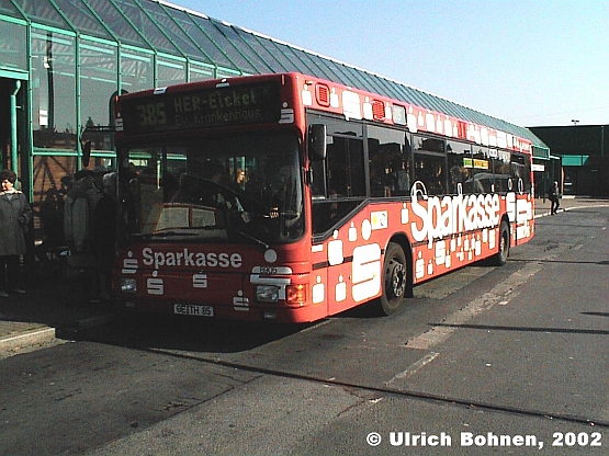 Es nicht schwer zu erraten, für welche deutsche Großbank Wagen 8905, ein MAN NL 202 der Bogestra, wirbt. Der MAN-Bus gehört zu den ersten Niederflurbussen, die überhaupt hergestellt wurden. Damals waren die Fahrgastsitze noch auf Podesten angebracht, und die untere Fensterlinie war höher als bei späteren Niederflurbussen.