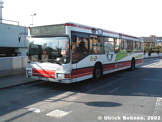 Auch die Bogestra besitzt Fahrzeuge mit der CityExpress-Lackierung. Dazu gehört der Wagen 9201, ein MAN NL 202 des Baujahres 1992. An dieser Stelle des Gelsenkirchener Hauptbahnhofes warten die Busfahrer mit ihren Fahrzeugen regelmäßig auf ihren Einsatz auf der CityExpress-Linie CE 56, so auch dieser Omnibus mit einer Werbung für den Polizeichor Gelsenkirchen.