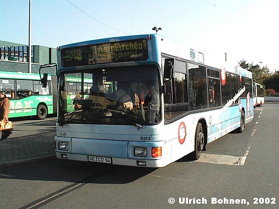Eine "wolkige" Sparkassen-Vollwerbung trägt dieser Bus des Baujahres 1993. Der Bogestra-Wagen 9313 mit dem Kennzeichen GE-CD 54 wurde am 11.10.2002 im Einsatz auf der Linie 348 am Gelsenkirchener Hauptbahnhof aufgenommen. Durch das Design der Vollwerbung, die vielleicht nicht jedermanns Geschmack ist, hebt sich das Fahrzeug auf jeden Fall im Gelsenkirchener ÖPNV hervor.