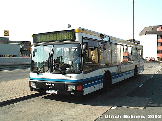 Auch die EVAG (Essener Verkehrs AG) verkehrt auf Gelsenkirchener Stadtgebiet, und zwar als Linie 194, die vom Gelsenkirchener Hauptbahnhof in den Essener Stadtteil Haarzopf führt. Kurz vor Fahrtantritt, aber noch mit durchgehend "gepunkteter" Fahrtzielanzeige gelang die Aufnahme von Wagen 3138 (Erstzulassung: 02.09.1996) am 11.10.2002 am Hauptbahnhof von Gelsenkirchen.