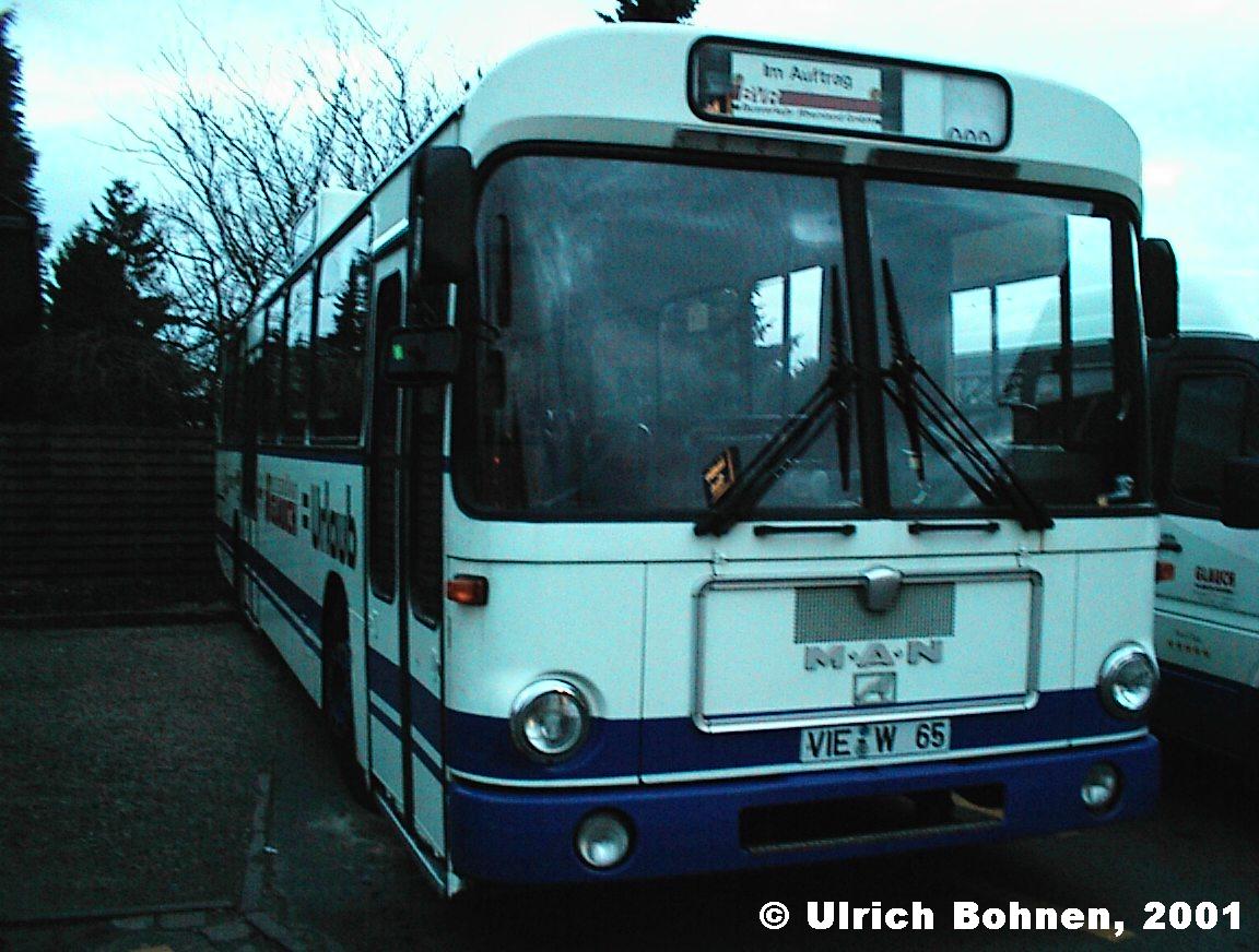 Kurz vor Einbruch der Dunkelheit entstand dieses Foto eines MAN SL 200 der Firma Glauch aus Viersen-Dülken. Der Bus des sonst eigentlich größtenteils nur aus Reisefahrzeugen bestehenden Fuhrparks von Glauch konnte am 28.12.2001 auf dem Betriebshof aufgenommen werden.