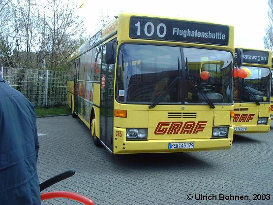 Auf dem Graf-Betriebshof waren unterschiedliche Linienbusse ausgestellt, so wie etwa dieser Mercedes-Benz O 405, der bei Graf als Wagen 375 in den umfangreichen Fuhrpark eingereiht ist. Desweiteren wurden vier neue Neoplan N 4416 Centroliner ausgestellt, von denen aber leider keine Fotos möglich waren (unfotogen eingeparkt...).
