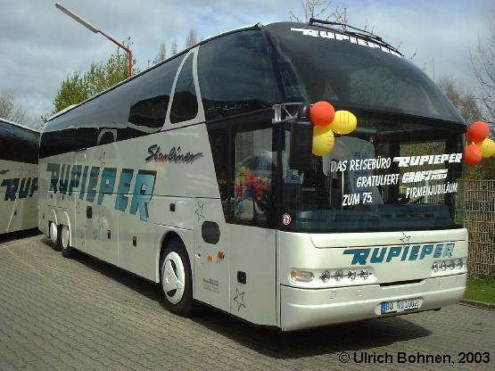 Auf dem Betriebshof befand sich auch dieser Neoplan Starliner N 516/3 SHDL, der zum Fuhrpark von Rupieper aus Bochum gehört. Der feierlich geschmückte Bus trägt das Kennzeichen BO-RU 1002; jedoch sind auf dem Kennzeichen eigenartigerweise keine Plaketten (TÜV, AU, etc.) zu finden.
