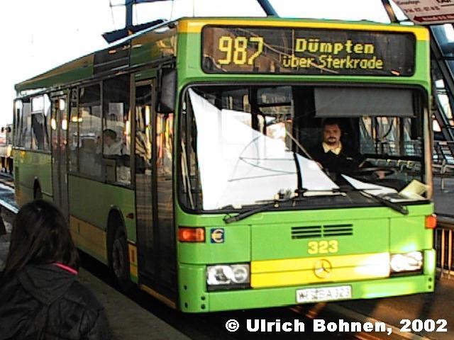Dieser Mercedes-Benz O 405 N2 von Gropp aus Dinslaken mit der Wagennummer 323 und dem Kennzeichen WES-BA 323 wurde am 08.01.2002 am Oberhausener CentrO abgelichtet. Gropp ist bereits seit über 25 Jahren ein Subunternehmer der STOAG und bedient mehrere STOAG-Kurse. Vielen Dank an André Baszanowski für diese Infos!