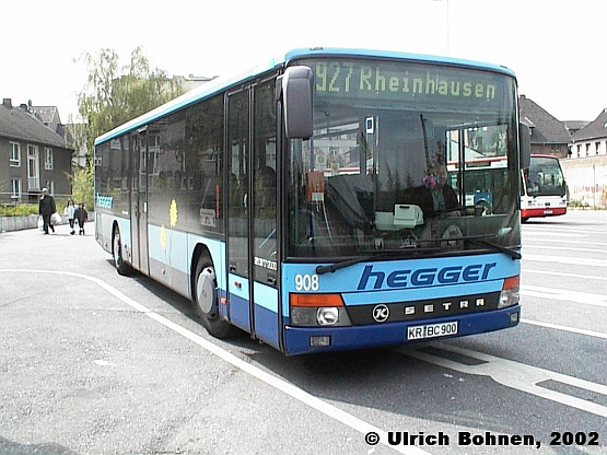 Hegger aus Krefeld war bis zur Firmeninsolvenz im Juli 2003 ein Subunternehmer der SWK Mobil GmbH und setzte Fahrzeuge auf zahlreichen SWK-Kursen ein. Dabei kamen vornehmlich Fahrzeuge der Marke Setra zum Einsatz, die allesamt durch ihre außergewöhnlichen Farbgebungen mit gelben Blumen auf der Seite auffielen, so wie dieser S 315 NF, der am 20.04.2002 am Krefelder Hbf. aufgenommen werden konnte.