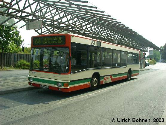 Dieser MAN A 10 der KWS ist nach meinen Informationen ein Beispiel für die aktuelle Unternehmens-Lackierung. Auffallend ist, das sie sich von der Vorgängerlackierung kaum unterscheidet - lediglich ein grüner Streifen ist hinzugekommen. Wagen 146 sonnt sich wiederum am Opladener Busbahnhof.