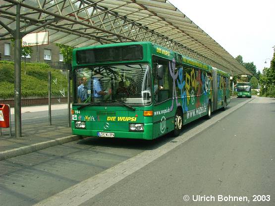 Auch Busse des Typs EvoBus-Mercedes O 405 GN² gehören zum Wupsi-Fuhrpark. Das Fahrzeug mit der Wagen-Nr. 194 ist ebenfalls mit der schon gezeigten Wupsi-Eigenreklame ausgestattet und zeigt sich hier am Nachmittag des 02.08.2003 während einer Pause in LEV-Opladen.