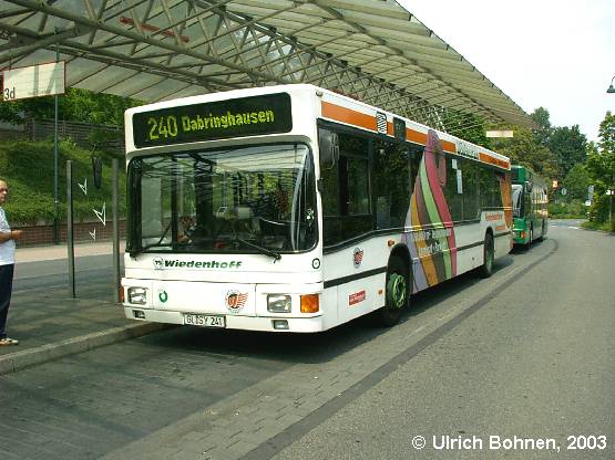 Wagen 241 der Gebrüder Wiedenhoff wirbt "Fenster übergreifend" für ein Geschäft, das verschiedene Bodenbeläge anbietet. Der MAN A 10 verbrachte zum Aufnahmezeitpunkt gerade eine Pause in LEV-Opladen.