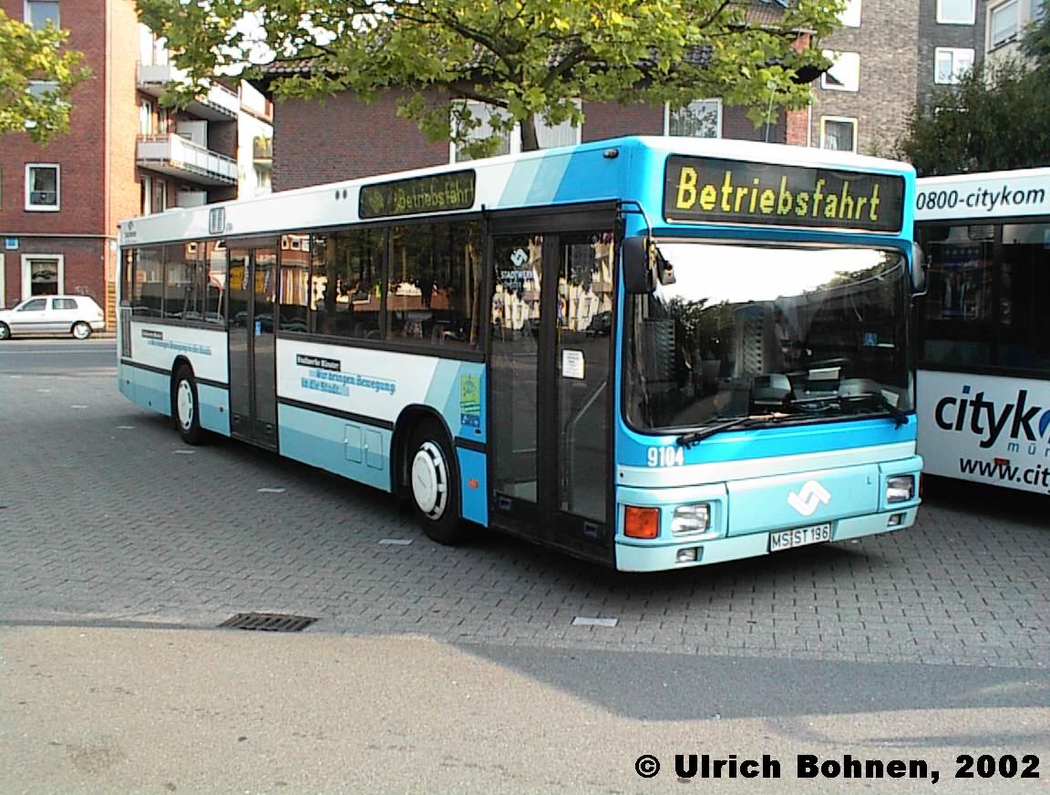 Zu einer Zeit, als die meisten anderen Verkehrsunternehmen noch Hochflurbusse beschafften, nahm die Stadtwerke Münster GmbH bereits Niederflurbusse der 1. Generation in ihren Fuhrpark auf. Wagen 9104 des Baujahres 1991 wurde am 20.07.2002 in der Nähe des Münsteraner Hauptbahnhofes aufgenommen.