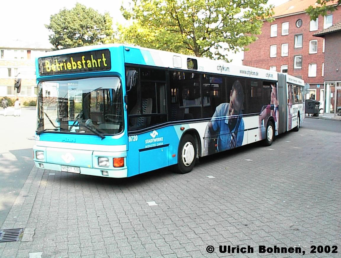 Auch MAN-Busse des Typs NG 262 zählen zum Fuhrpark der Stadtwerke Münster GmbH, wie z. B. Wagen 9720 aus dem Jahre 1997. Der Vertreter der 2. Niederflurbusgeneration mit abgesenkter Seitenfensterlinie verbrachte am 20.07.2002 in Münster seine Pause und konnte in der Nähe des Hauptbahnhofes aufgenommen werden.