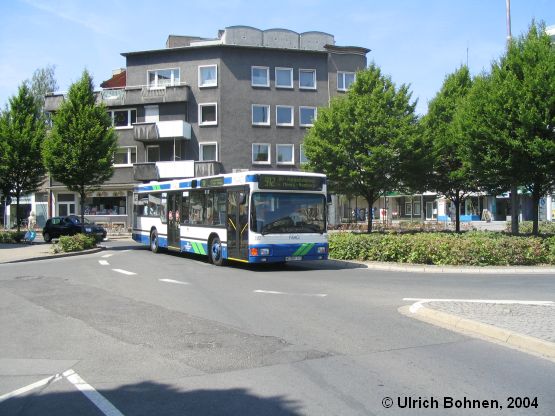 Der NIAG-Wagen 5512, ein MAN NL 202 des Baujahres 1994, trägt ebenfalls die recht ansprechende NIAG-Lackierung. Das Foto gelang am ziemlich warmen 29.05.2004 an einem Kreisverkehr in der Innenstadt von Moers am Niederrhein.