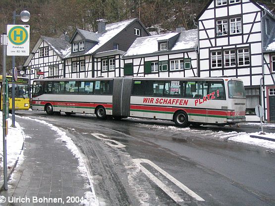 "Wir schaffen Platz!" - Mit diesem Slogan sind beide Kässbohrer-Setra SG 221 UL der RVE beklebt. Das Foto entstand am Ende der Wendeschleife nach der Haltestelle Monschau Parkhaus, als der KOM sich gerade wieder auf den Weg nach Imgenbroich machte. Da die Aufnahme am frühen Nachmittag des 18.12.2004 entstand, fuhren natürlich die meisten Leute nach Monschau und nicht schon wieder zurück nach Imgenbroich. Daher ist der Bus auf diesem Bild zum Aufnahmezeitpunkt ziemlich leer.