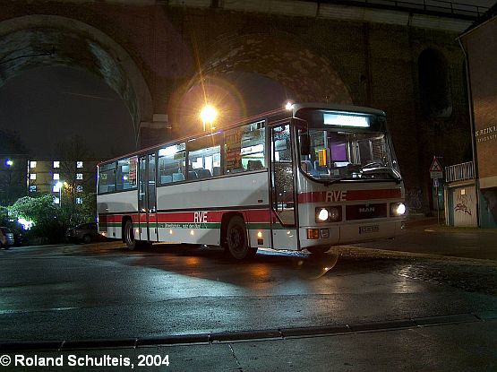 Zum Abschluss dieser Fotoserie noch ein besonderes Bild: Nach und nach werden seit einiger Zeit die MAN ÜL 312 (Baujahr 1995) der RVE ausgemustert. Dieses stimmungsvolle Bild entstand am Abend des 18.12.2004 auf dem RVE-Betriebsgelände in Aachen und zeigt den Wagen 5015, der aber noch für die RVE fährt.