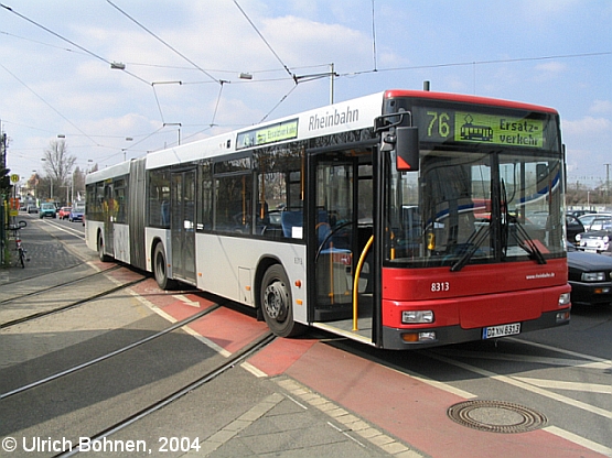 Am Wochenende 27.03./28.03.2004 konnte die Rheinbahn-Linie U 76 (Düsseldorf-Krefeld) nicht bis zur Krefelder Endstation Rheinstr. durchfahren, da Schienen ausgetauscht wurden. Deshalb richtete die Rheinbahn einen Schienenersatzverkehr (SEV) ein, der die letzten (bzw. in Gegenrichtung ersten) drei Haltestellen auf Krefelder Gebiet bediente. Eingesetzt wurden zwei Gelenkbusse, zum einen Wagen 8313, ein MAN A 23, ...