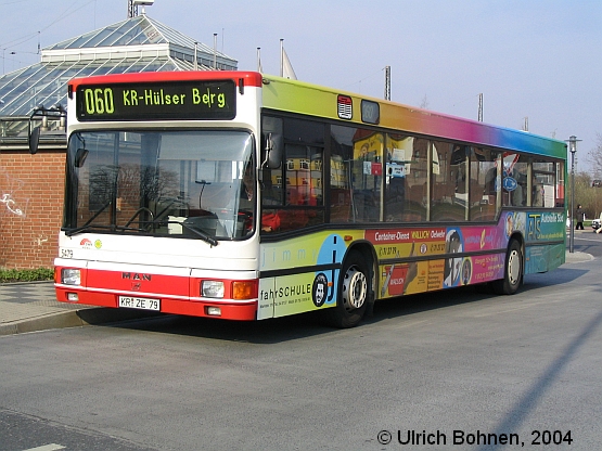 Hier ein Vertreter der allseits "beliebten" Regenbogenwerbung: Wagen 5479, ein MAN NL 202, konnte bei herrlichem Sonnenschein am 27.03.2004 an der Haltestelle Krefeld Hbf.-Süd aufgenommen werden.