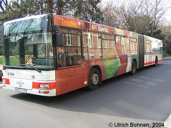 Mit einer meiner Meinung nach vom Design her nicht gelungenen Werbung für die Schüler-Fahrkarte "SchokoTicket" verkehrt dieser MAN A 23 der SWN in Neuss und Umgebung. Wagen 106 konnte so gerade noch rechtzeitig abgelichtet werden, bevor den Kamerabereich verließ.