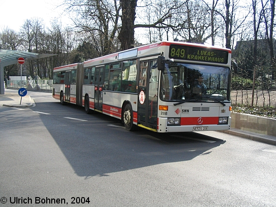 Dies ist das Vorgängermodell der aktuellen Citaro-Baureihe von Mercedes: Der SWN-Wagen 208, ein Mercedes O 405 GN mit einem Aufkleber in Sachen Einstieg vorn ("Hier geht's los") auf der 1. Türe, verlässt ebenfalls die Neusser Haltestelle Zolltor.