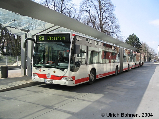 Hier ist Wagen 225, ein EvoBus-Mercedes O 530 G, am 27.03.2004 an der Haltestelle Zolltor in Neuss zu sehen.