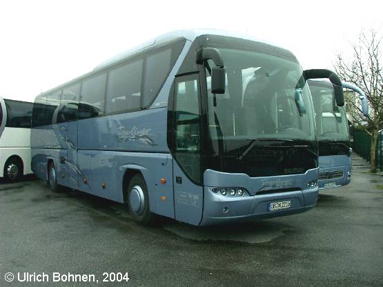 Der neueste Reisebus-Typ von Neoplan ist der Tourliner, ein Bus aus türkischer Fertigung. Hier ist ein Vorführwagen des Typs N 2216 zu sehen, der das passende Nummernschild besitzt.