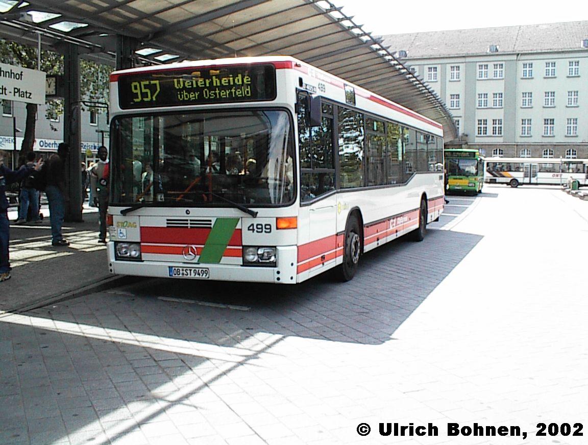 Seit kurzem tragen einige Busse der Stadtwerke Oberhausen AG (STOAG) gelbe oder grüne Diagonalstreifen unterhalb der Frontscheibe, so auch dieser Mercedes-Benz O 405 N2 des Baujahres 1996, der am 28.06.2002 an der modern gestalteten Bushaltestelle am Oberhausener Hauptbahnhof aufgenommen werden konnte.