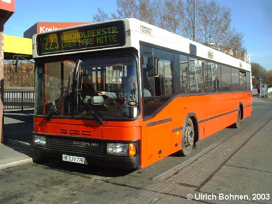 Am mittlerweile recht heruntergekommenen Busbahnhof der Stadt Marl (ein neuer Bus-Bf. ist in Planung) konnte dieser Neoplan N 4015 der Vestischen Straßenbahnen (Baujahr 1989) abgelichtet werden. Bemerkenswert bei diesem Typ ist, dass die vorderen Scheinwerfereinheiten aus der Mercedes-S-Klasse der späten 70er Jahre des letzten Jahrhunderts stammen.
