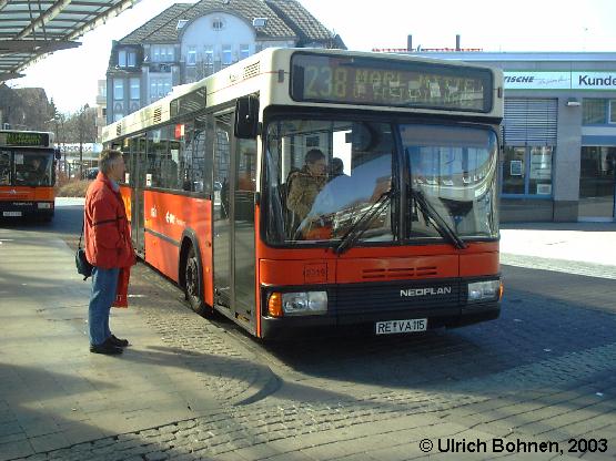 Dieser Neoplan N 4015, Wagen 2219, stammt aus dem Jahre 1989 und rundet diese Fotoserie aus Recklinghausen ab, die am 22.03.2003 entstand. Man kann sagen, dass der Recklinghäuser ZOB gut für Busaufnahmen von beiden Seiten geeignet ist, wenn es nur ein wenig bewölkter ist und keine Menschen den Bus verdecken...! ;-)