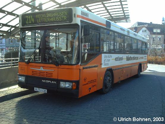 Offensichtlich einige neue Karosserieteile (aufgrund farblicher Unterschiede) erhielt dieser 1987er Neoplan N 416 SL (Wagen 2543), dessen letztes Stündlein wohl in diesem Jahr schlagen dürfte, wenn nämlich Mercedes-Busse in die zukünftige Citaro-Hochburg Recklinghausen gelangen. :-)