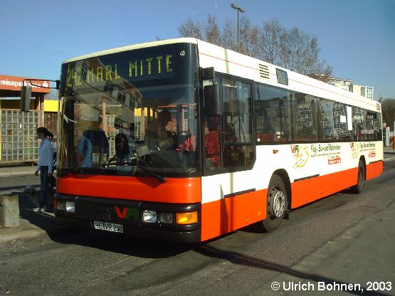 Der Vestische Reisedienst (VR) ist ein weiterer Subunternehmer der Vestische Straßenbahn GmbH. Unter anderem kommen auch frühe Vertreter der 3. Baureihe von MAN-Niederflurbussen, so wie dieser MAN A 20 mit Podesten im Innenraum und hochgezogener seitlicher Fensterlinie, zum Einsatz. Am Marler Busbahnhof "sonnte" sich das Fahrzeug am 22.03.2003.