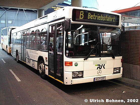AKTUALISIERTER TEXT (Danke für die Infos an Ulrich Kissmann): Die weißen EvoBus-Mercedes O 405 N² wurden 2002 für die RVK-Tochtergesellschaft RBR (Regio-Bus Rheinland GmbH) bestellt, die ihren Verwaltungssitz im Kölner RVK-Haus hat und die mit den Bonner Stadtwerken Bonn (SWB) den Bonner Betriebshof Friesdorf benutzt. Die RBR tritt in Bonn als Subunternehmer für die Stadtwerke Bonn auf, und dazu wurden eine ganze Reihe von Fahrzeugen dieses Typs beschafft, die alle die RBR-Farbe weiß erhielten. Es war wohl geplant, die Fahrzeuge für die Niederlassung Meckenheim zuzulassen und einen Wartungsvertrag mit den SWB abzuschließen. Irrtümlicherweise wurde wohl ein Wartungsvertrag mit einem Rheinbacher Unternehmen abgeschlossen, so dass die Busse im SWB-Netz fuhren, aber bei Reparaturen und regelmäßigen Wartungen immer nach Rheinbahn gefahren werden mussten.